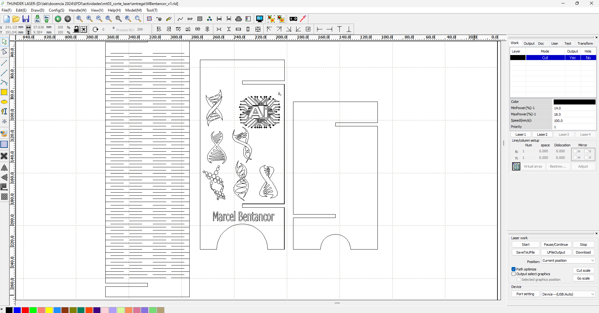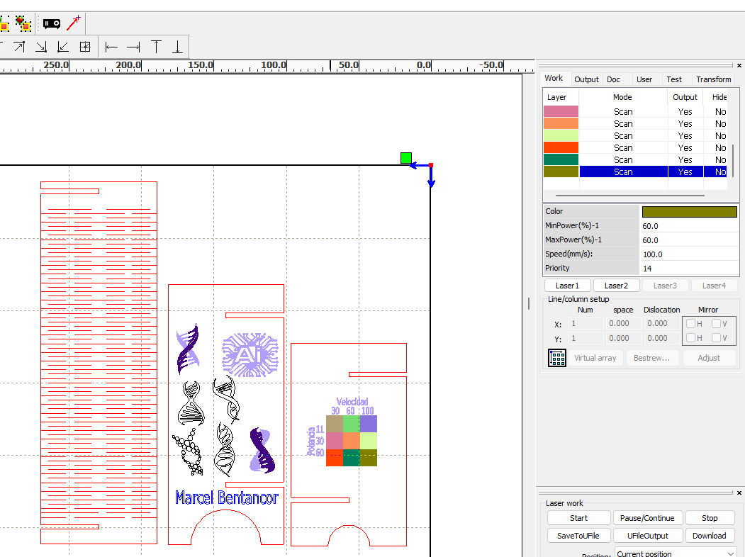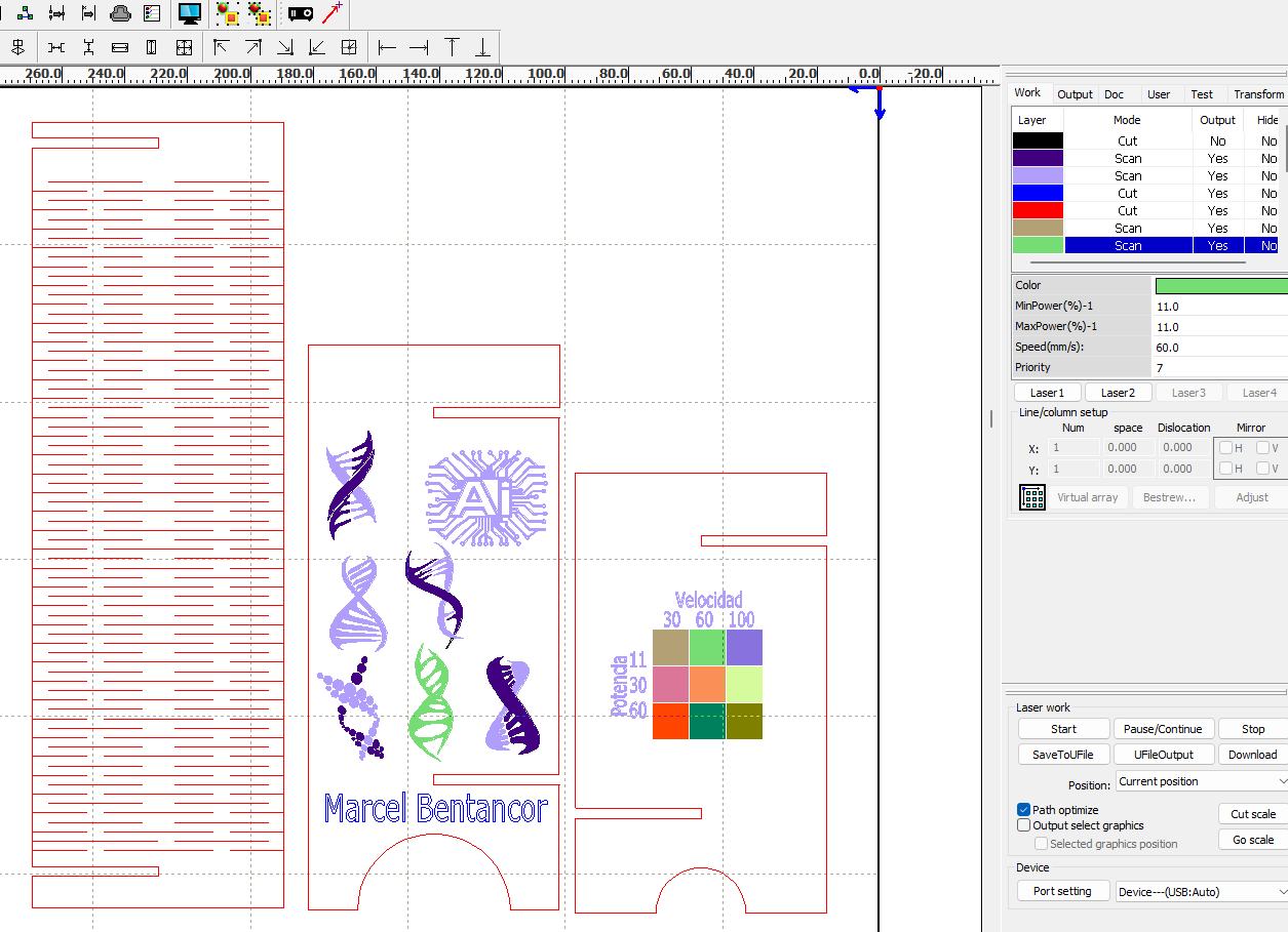 Luego de configurados los diferentes tipos de operación del láser para cada una de las trayectorias vectoriales del diseño (Figura 10) se guardó el archivo .rld, y se exportó el gcode bajo la forma de un archivo .rd. El formato .rd es un archivo del tipo binario y su formato es propietario, por lo tanto no puede visualizarse correctamente con un editor de texto, sino que debe ser leído con el programa rdworks.