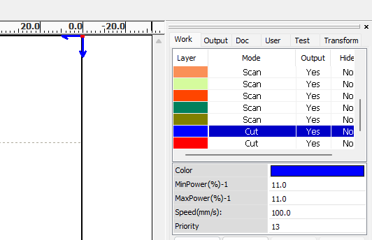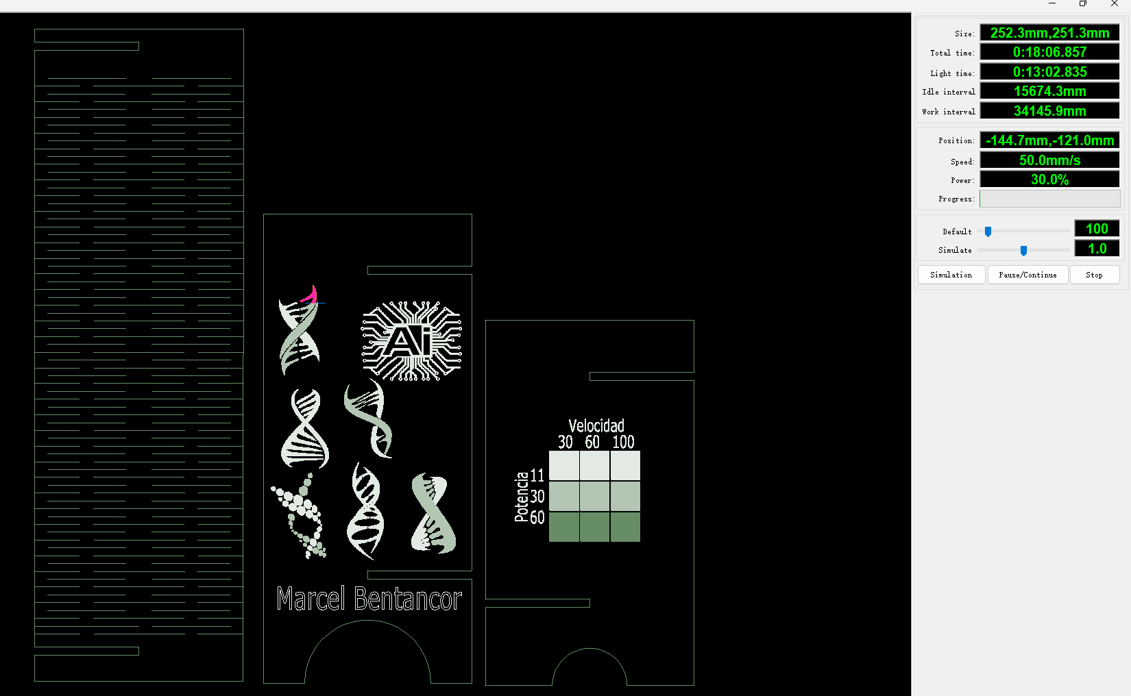 Para evitar movimientos de la pieza mientras la procesa el CNC láser, las capas de trabajo del láser se ordearon (de arriba hacia abajo) de esta forma (Figura 9): rasterizado (scan), grabado (cut), corte (cut, se llama igual pero tiene configuracion diferente a la usada para el grabado).