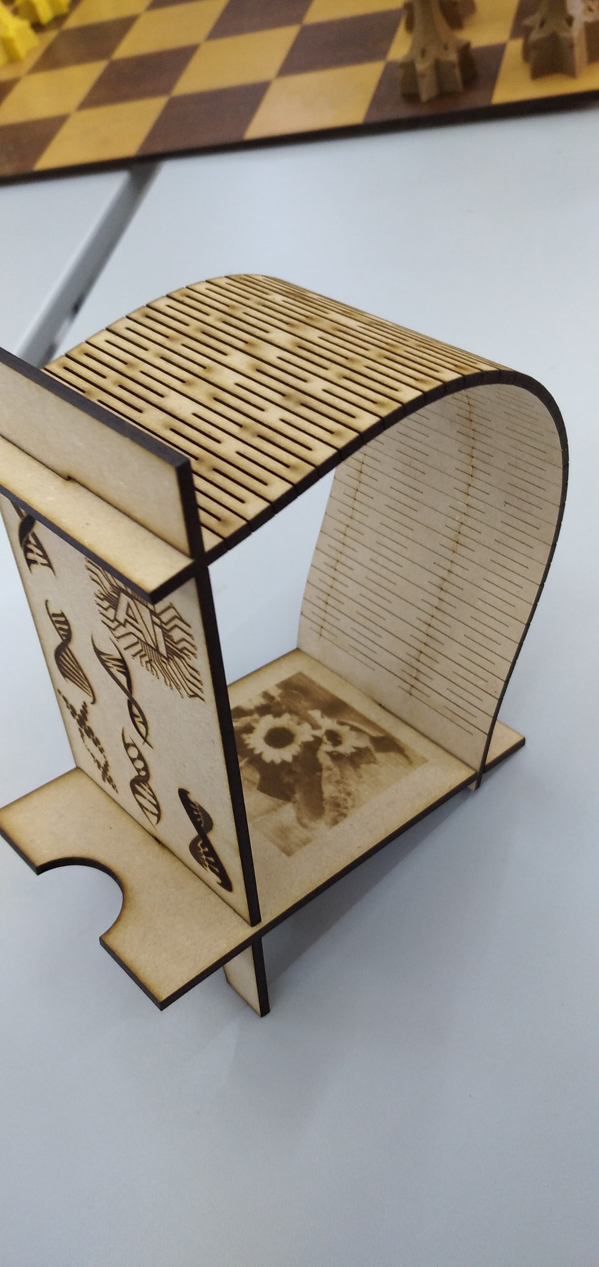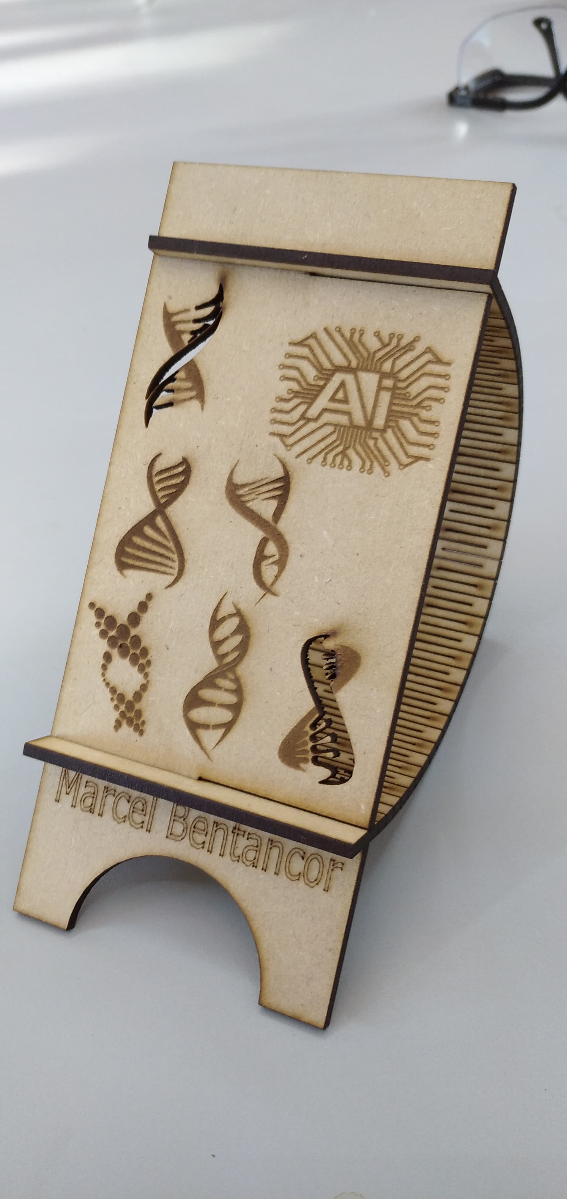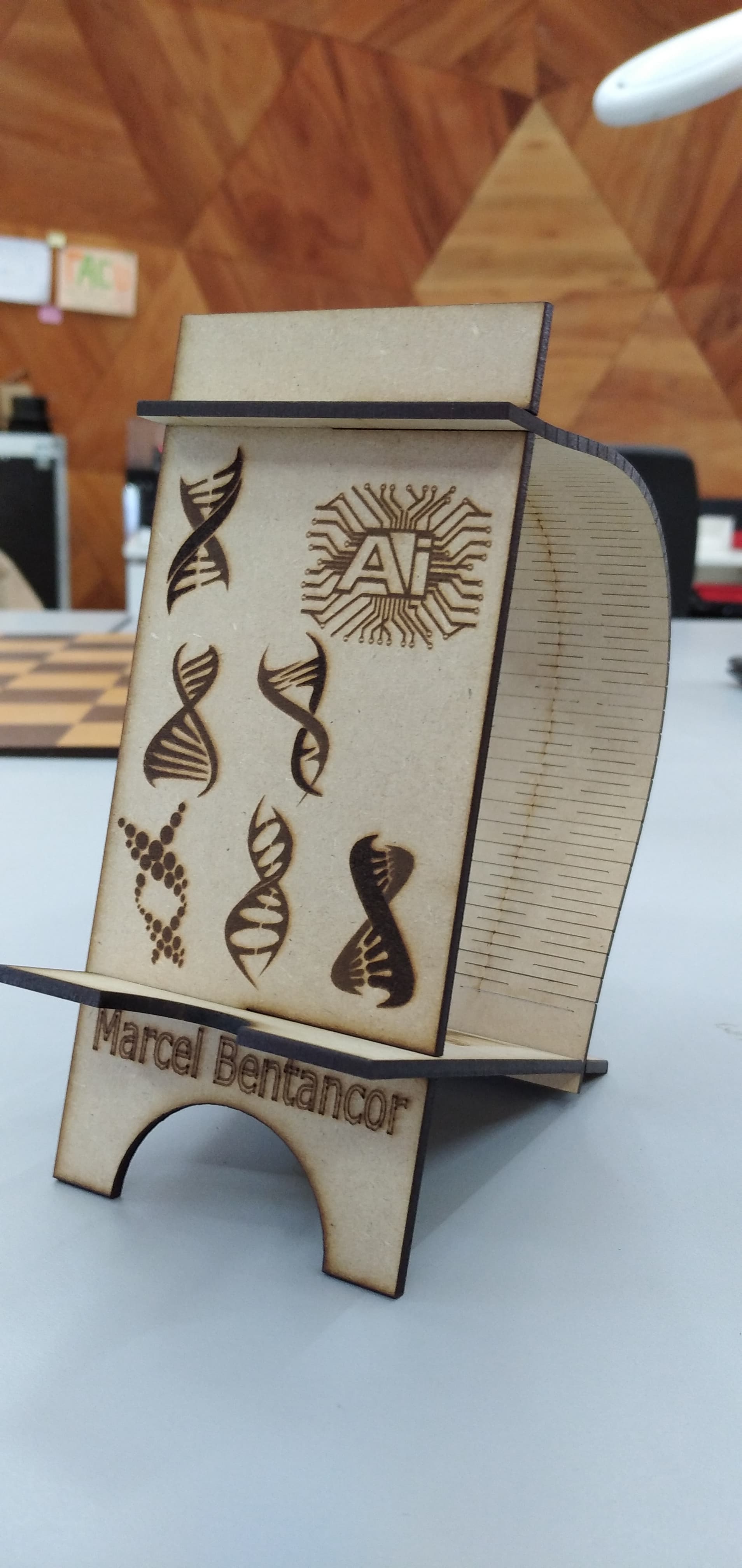 Figura 16, versión final del soporte de celular mostrando la fotografía rasterizada sobre su supericie y el soporte curvo hecho con la técnica de kerfing.