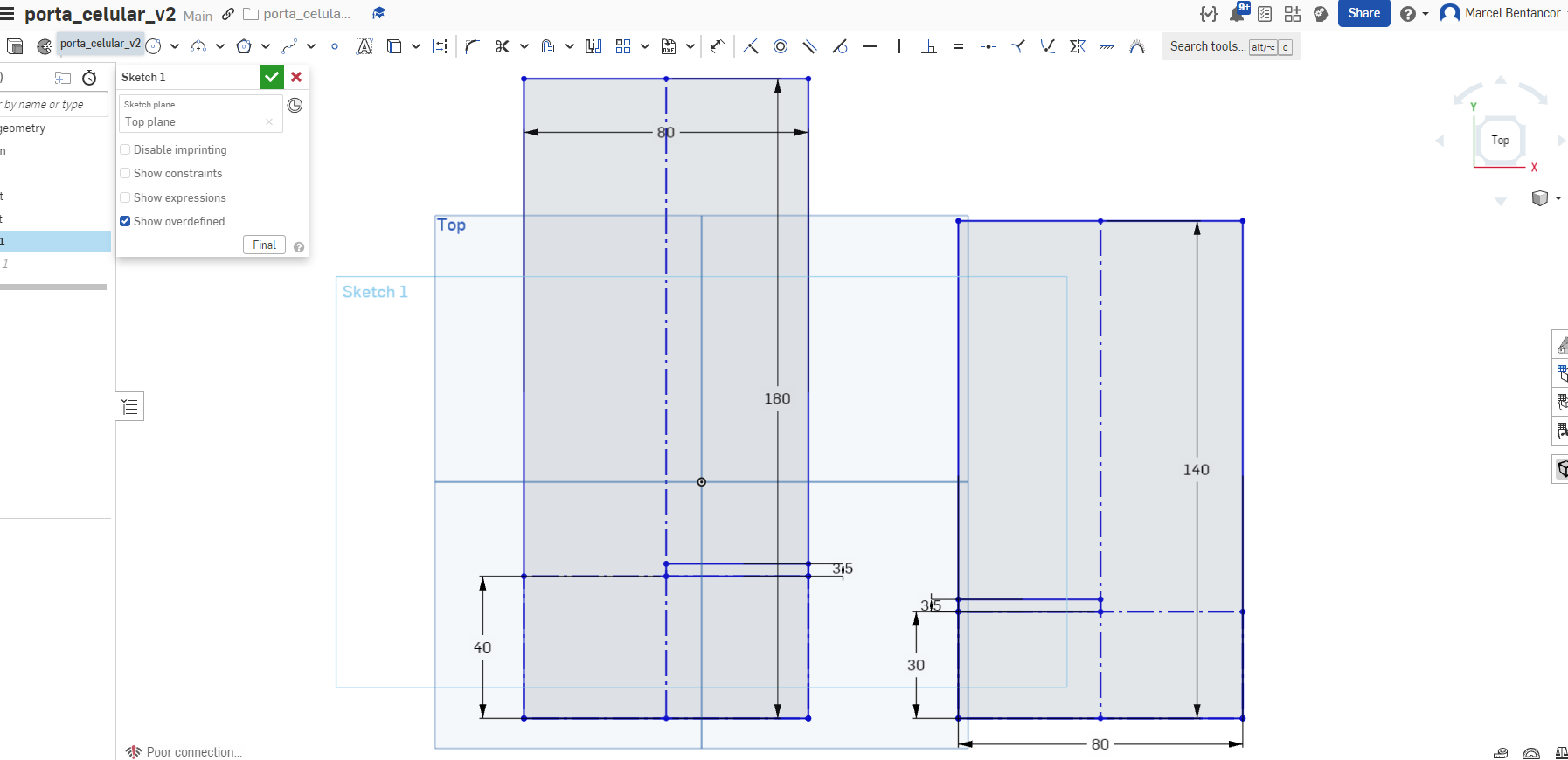 Figura 1, vistas generales del boceto y del bosquejo 3D de la pieza, hecho en Onshape.