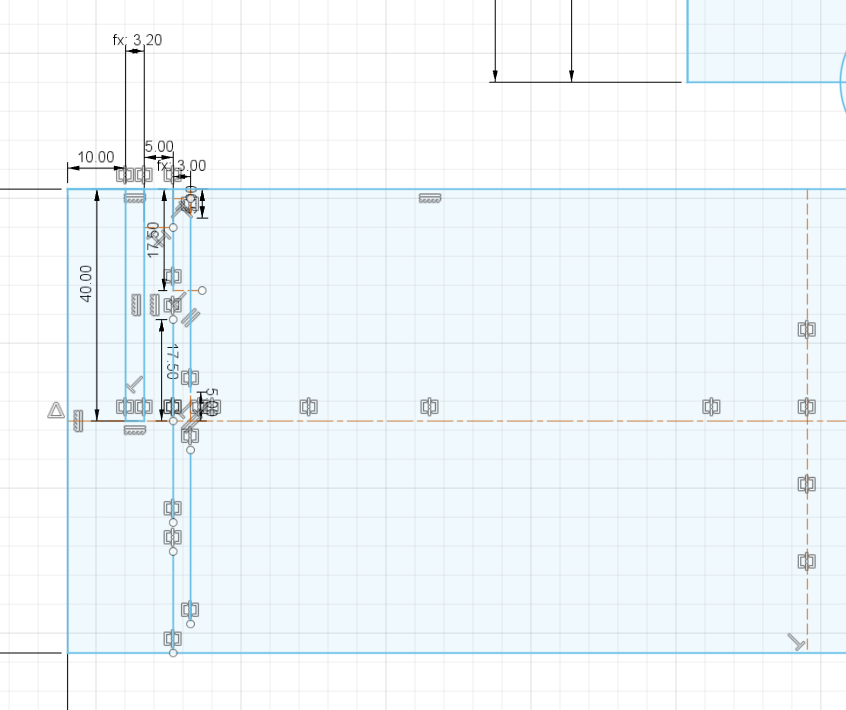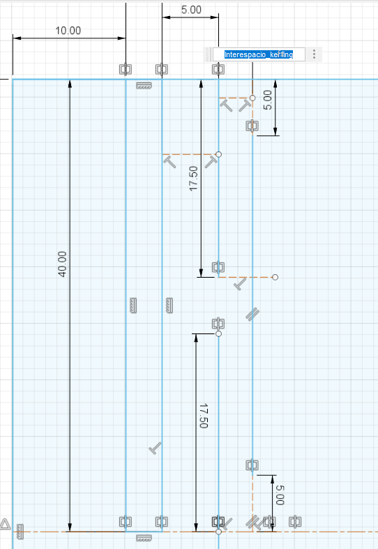 Luego, ya con una ide más clara de diseño partir del boceto hecho en Openshape, usé el programa Fusion para hacerlo, ya que busco mejorar el manejo que tengo del mismo, en particular, para lograr un diseño parametrizado. Tres medidas del boceto fueron parametrizadas (figura 2): - espesor del material - holgura para encastres - espaciados para ranuras del kerfing