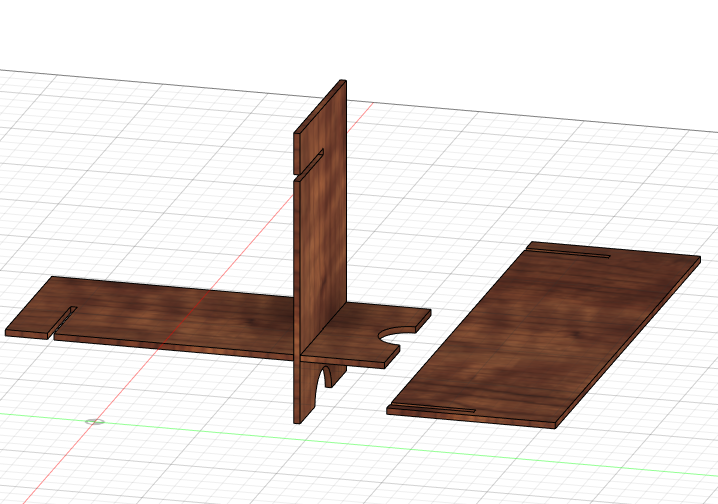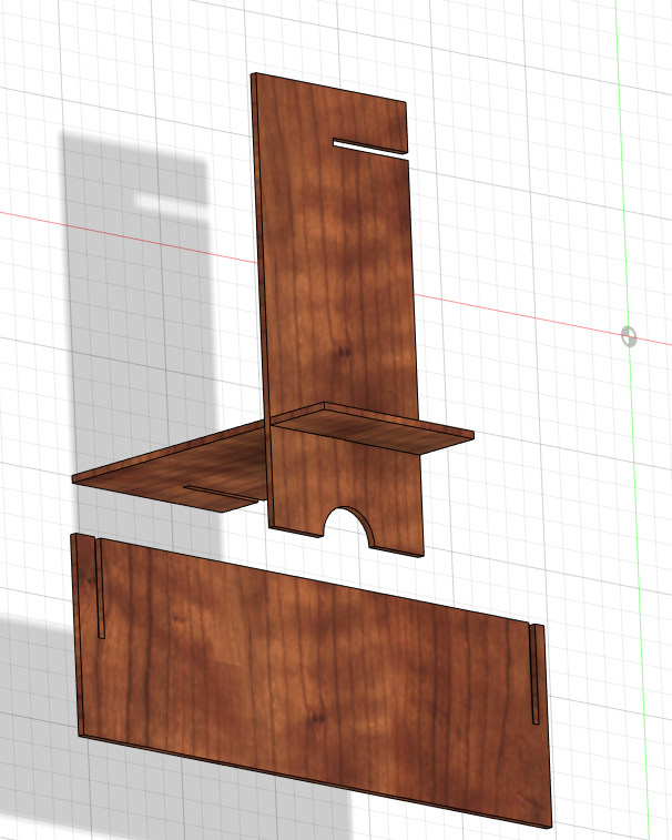 El resultado final de la pieza se muestra en las figuras 16 y 17. Esta pieza consta de tres piezas encastrables, en una de la cuales he implementado la técnica de kerfing. La funcionalidad de la pieza, como soporte de celular logró ser desempeñada satisfactoriamente. Logrando sostenerlo en el ángulo apropiado y permitiendo ser conectado mediante un cable al transformado a traves de los orificios de la pieza central y la base.