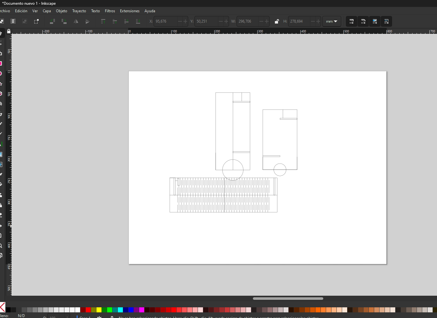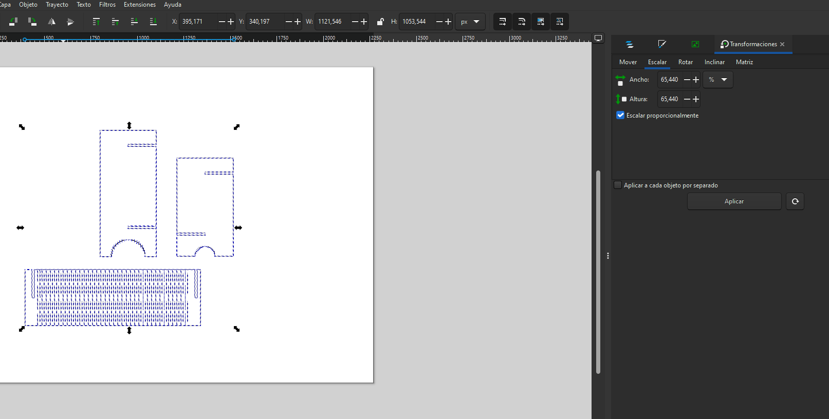 El boceto exportado como archivo .dxf desde el programa Fusion, fue importado en un documento del programa Inkscape. Usando la herramienta de medición se obtuvo la medida del ancho de uno de los soportes, y se calculo la relacion respecto a la medida real o desesada. Usando ese factor de escalabilidad se transofrmó el tamaño de las piezas, teniendo cuidado de conservar la relación de proporciones entre el ancho y la altura.