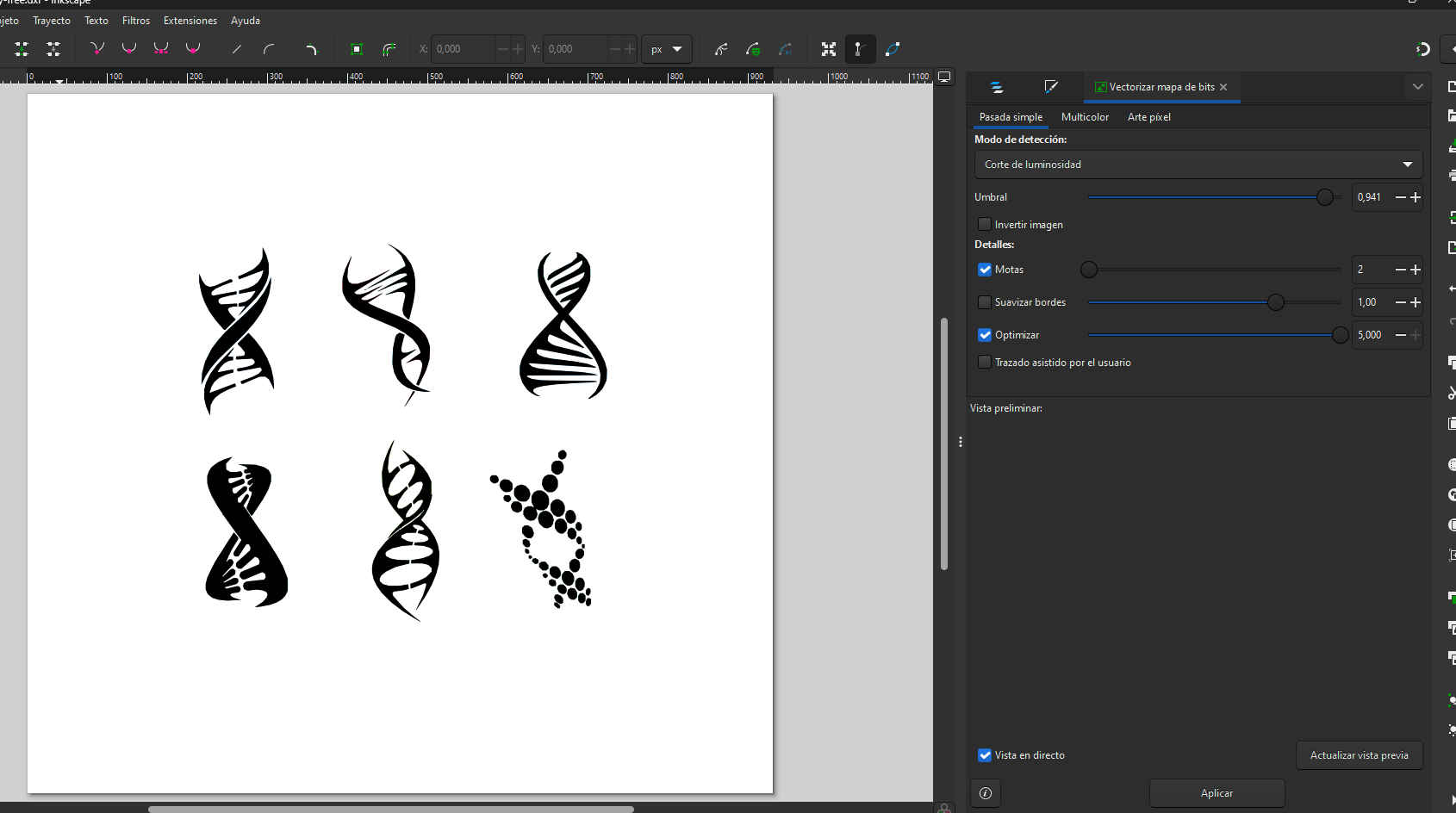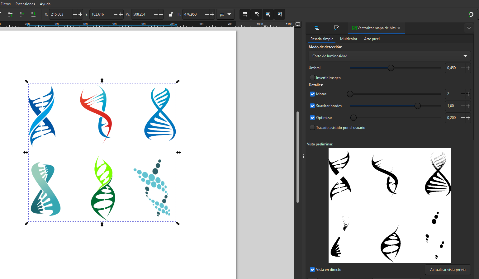 Luego busqué en internet figuras libres sobre ADN e inteligencia artificial, las importé en Inkscape y allí las vectoricé. Cambié las opciones de vectorizado de tal forma de mantener un nivel de detalle relativamente alto. En Inkscape, usando la herrmaienta de inserción de texto incluí mi nombre en la (Figura 7). También diseñé una grilla de 9 x 9 cuadraddos, para que el soporte tmabien sirva como referencia sobre los valores de velocidad y ptencia del laser y cual es su efecto sobre el rasterizado de imágenes en el soporte que se empleará para esta pieza. En esta pare usé herramietnas básicad de alineamiento, distribucioón y rotacion que brinda Inkscape.