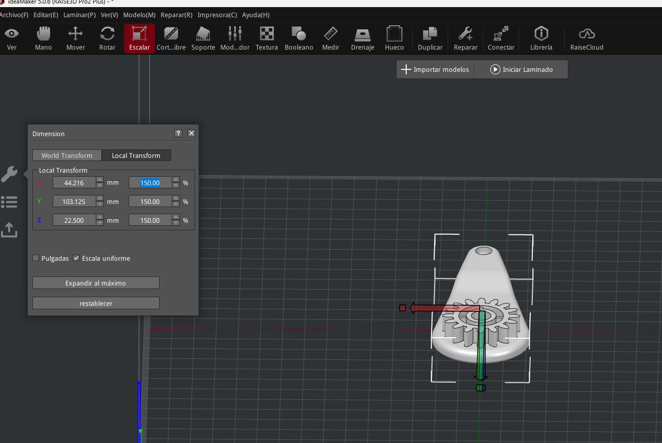 Roté la pieza de tal forma de facilitar la remoción de los soportes que se generen (figura 3). Aumenté el tamaño de la pieza escalándola de manera uniforme al 150% de su tamaño original (figura 4).