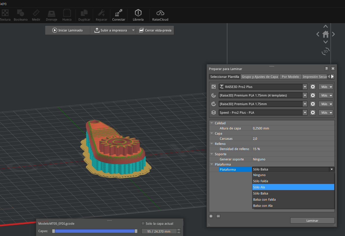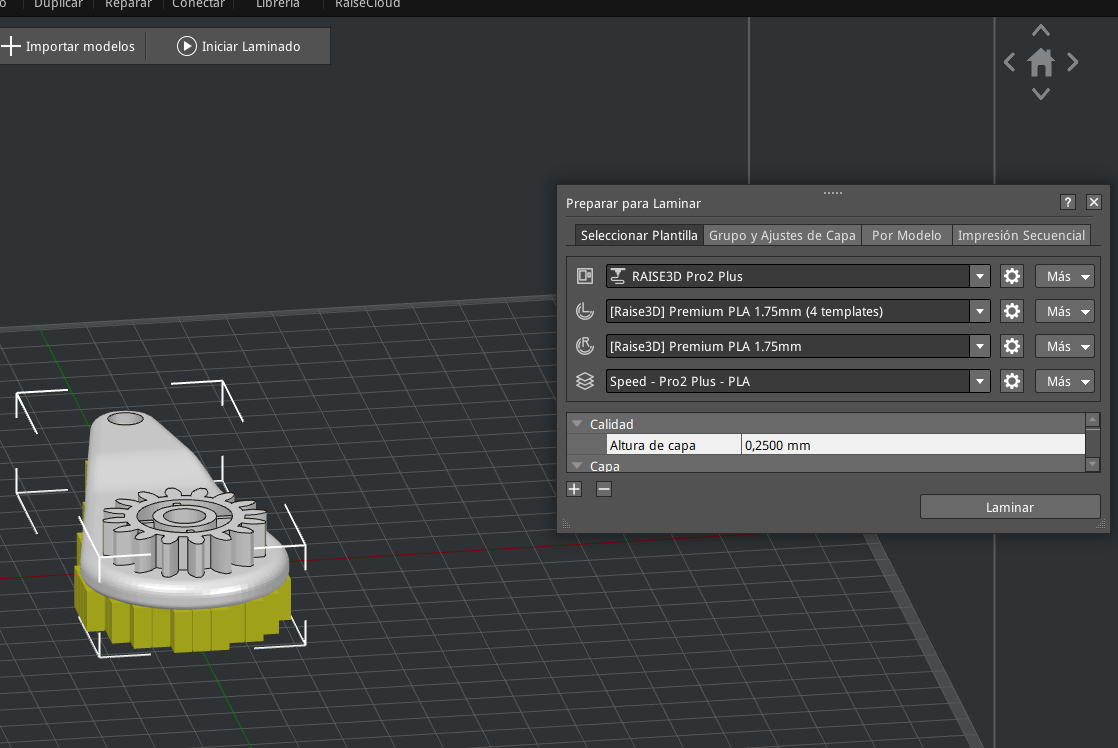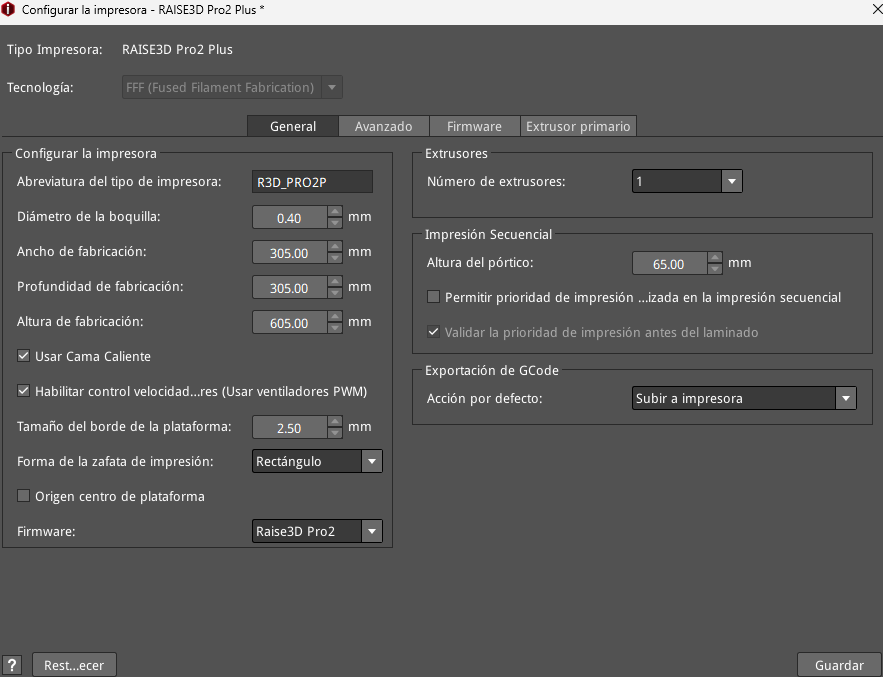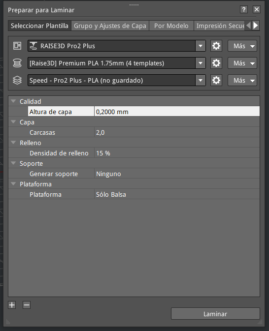 Luego verifiqué que la impresora seleccionada sea la RAISE3D Pro2 Plus, que es la que tendré disponible en UTEC (figura 6) y que en la sección “plataforma” estuviera seleccionada la opción “Sólo Balsa” (figura 7) allí también configure la altura de capa en 0,2000 mm y el número de perímetros de pared (carcasas) igual a 2.