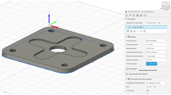 Se elije el recorte del contorno externo de la pieza haciendo la operación: 2D contorneado > Cadena cerrada, y activo la casilla “Apoyos” para crear las conexiones que finalmente romperé para liberar la pieza del resto del material.
