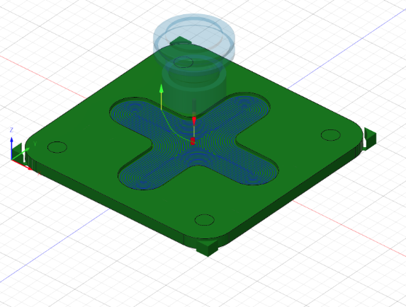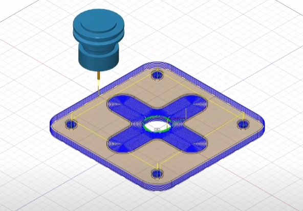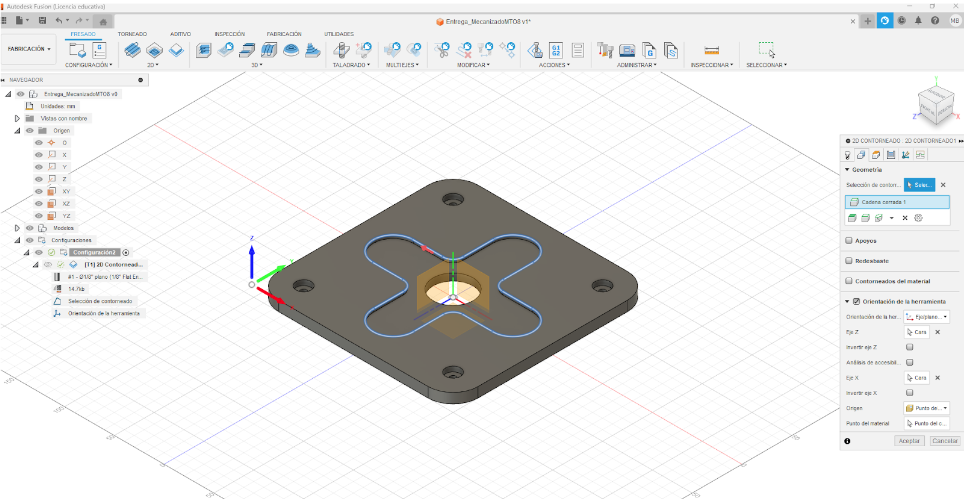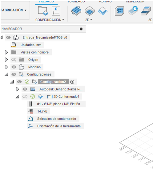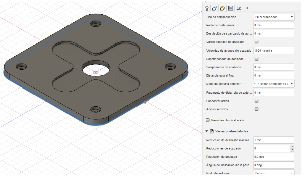 Para diminuir el uso de la fresa en sectores, como circulo central de esta pieza, que no forman parte de la pieza final, reordeno las operaciones de mecanizado, haciendo en primer lugar el recorte del circulo central. Luego Reconfiguré la operaicón 2D cajeras sobre el diseño cruciforme central.