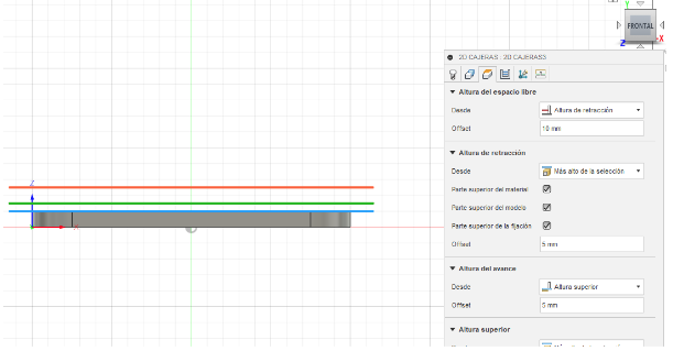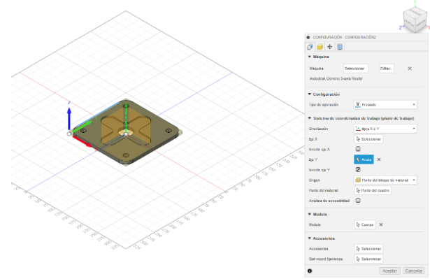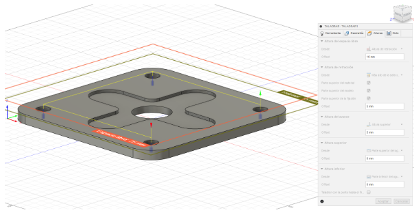 Luego paso a hacer los diferentes proceso de mecanizado, en cada uno debo configurar: 1- El tipo de mecanizado, por ejemplo: 2D cajeras, taladro o contorno. 2- Tipo de herramienta 3- Geometría (consiste en especificar la trayectoria de la herramienta) 4- Alturas (Para evitar colisiones de la herramienta con el material al trasladarse ésta) 5- Se configuran las pasadas, indicando la profundidad de cada éstas. 6- Se configuran las conexiones finales que se dejan en la pieza antes de liberarla.