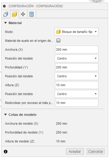 En la pestaña de material, selecciono: Modo > Bloque de material fijo, y verifico que las medidas configuradas sean: Anchura 200mm, Altura 200mm, Profundidad 10mm (figura 1e).