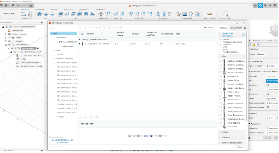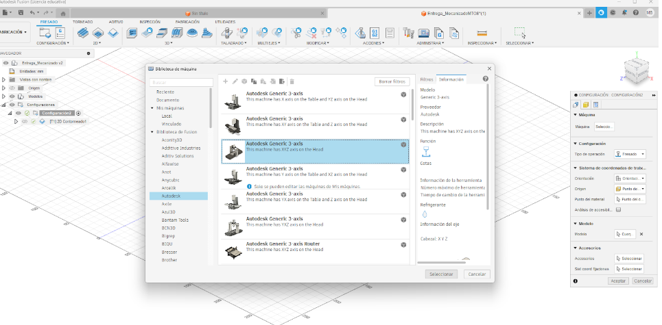 Luego de guardar el documento continué con el mismo abierto en Fusion 360 y allí configuré la máquina indicada por el enunciado del ejercicio, eligiendola desde el menú de la izquierda “Configuración” y luego eligiendo: Máquina > Seleccionar (Figura 2).