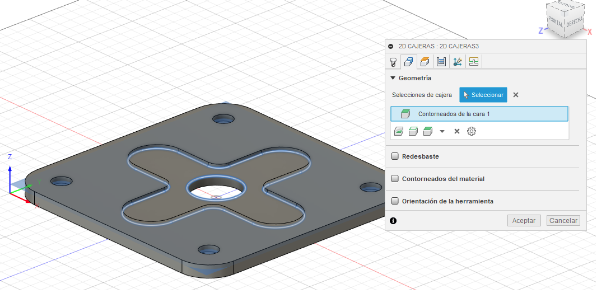 Para el diseño central cruciforme, elijo una operación de 2D cajeras > Contorneados de la cara > Selecciono el diseño cruciforme central (figura 5).