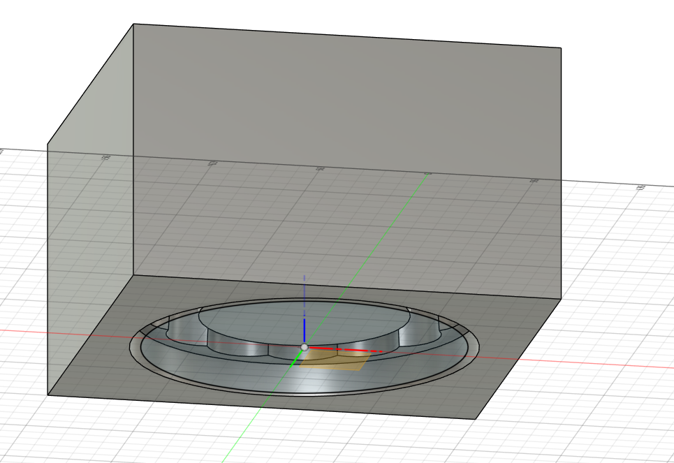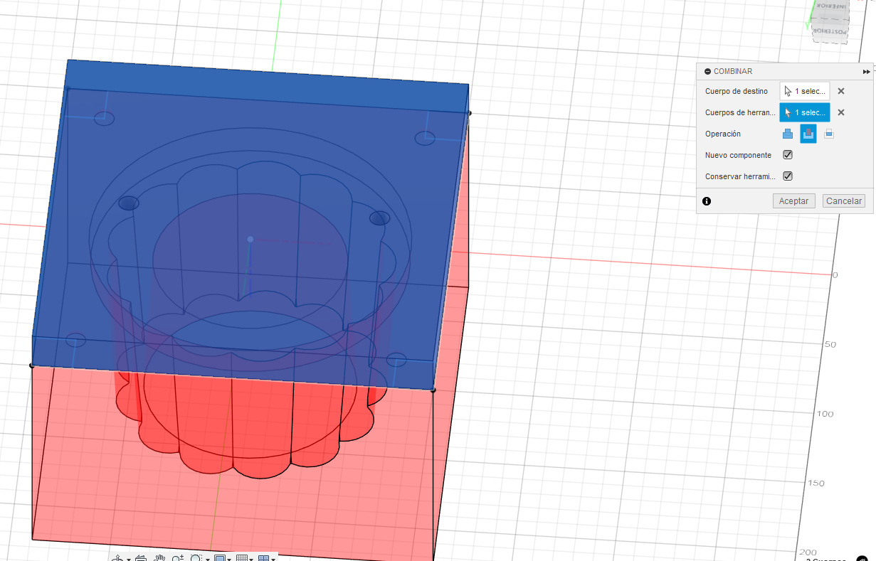 Luego con una operacion de combiando en modalidad corte, resté la pieza “maceta” a la pieza “molde_sup”, lo cual ahuecó a éste último (figura 8).
