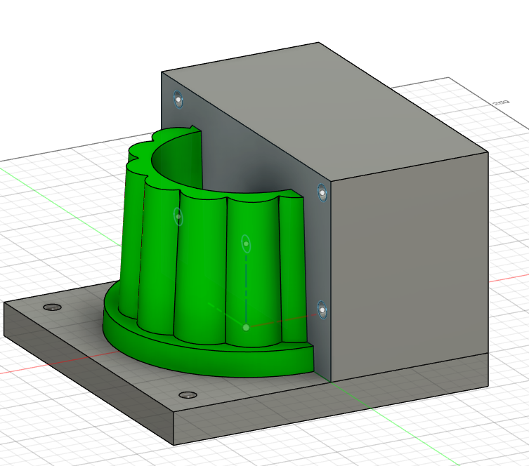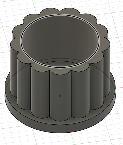 Actualización: Luego de recibir la sugerencia del docente encargado del módulo sobre dividir en tres partes del molde a fin de facilitar el desmolde, se implementó este cambio en el diseño .En al figura 13 se observa la vista externa del molde. En la figura 14 se aprecian los encastres de las piezas del molde que está previstas retirarlas lateralmente. En la figura 15 se muestra la maceta en el contexto de dos de las tres partes del molde ensambladas.