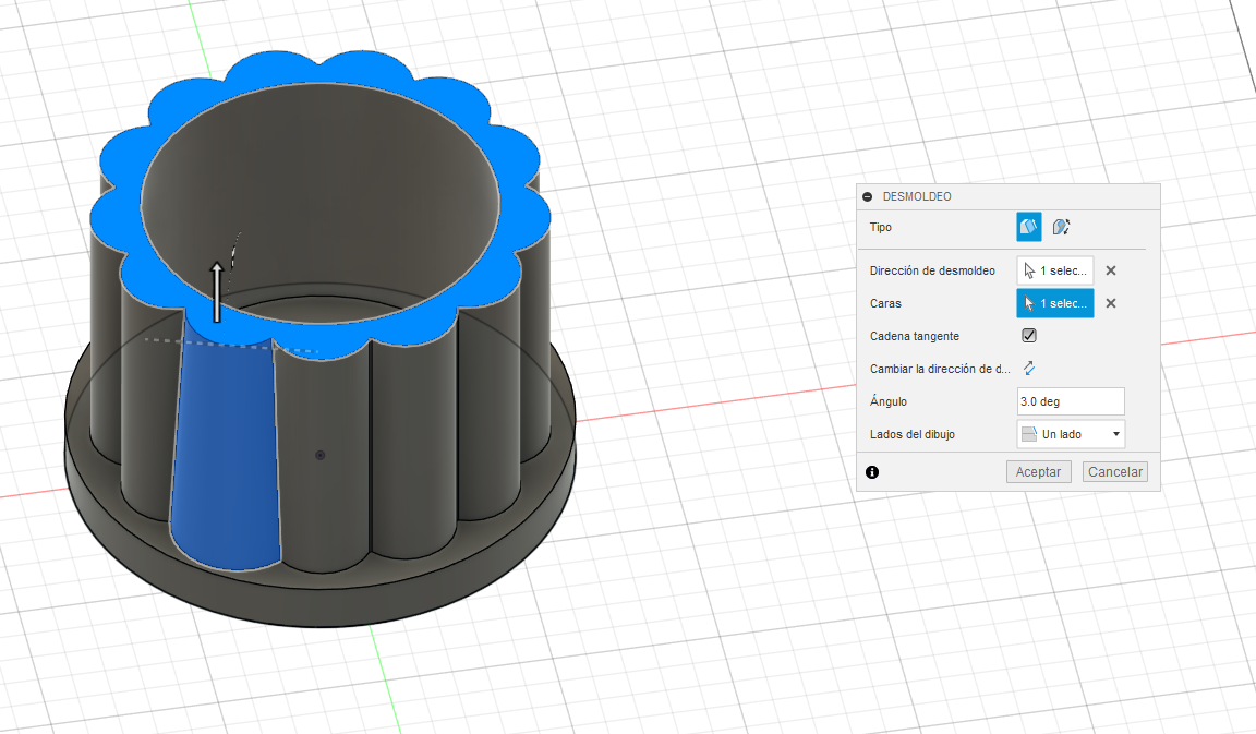 En la figura 3 se aprecia que la maceta tiene varias segmentos de paredes verticales, los cuales obstaculizarían el desmoldado de la pieza. Por lo tanto se genera un ángulo de desmolde sobre las paredes exteriores para facilitar la separacion del molde, se eligió un ángulo de desmoldado de 3 grados.