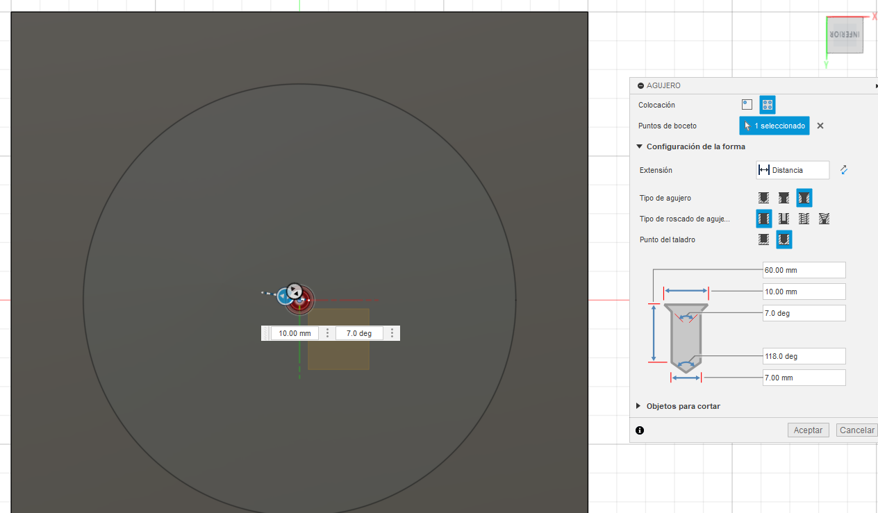 En la pieza “molde_inf” se generaron dos perforaciones (figura 9): una para usar como vertedero del material fundido y otra como respiradero para poder evacuar el aíre desplazado durante el vertido del material fundido.